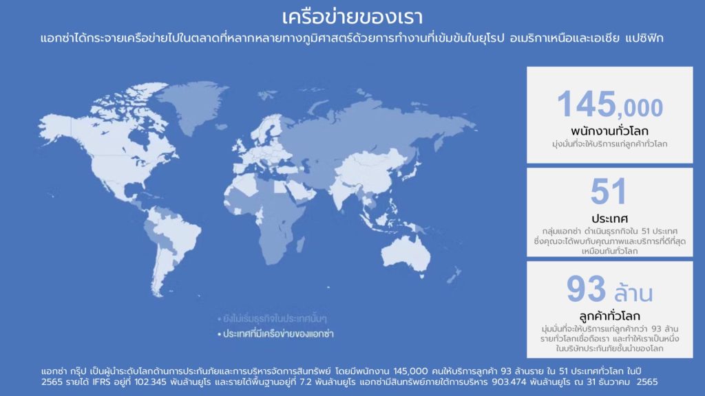 กลุ่มแอกซ่า ให้บริการลูกค้าทั้งในยุโรปตะวันตก อเมริกาเหนือ เอเชียแปซิฟิค และมีความมุ่งมั่นที่จะเสริมสร้างการเติบโตของธุรกิจในการเพิ่มความแข็งแกร่ง