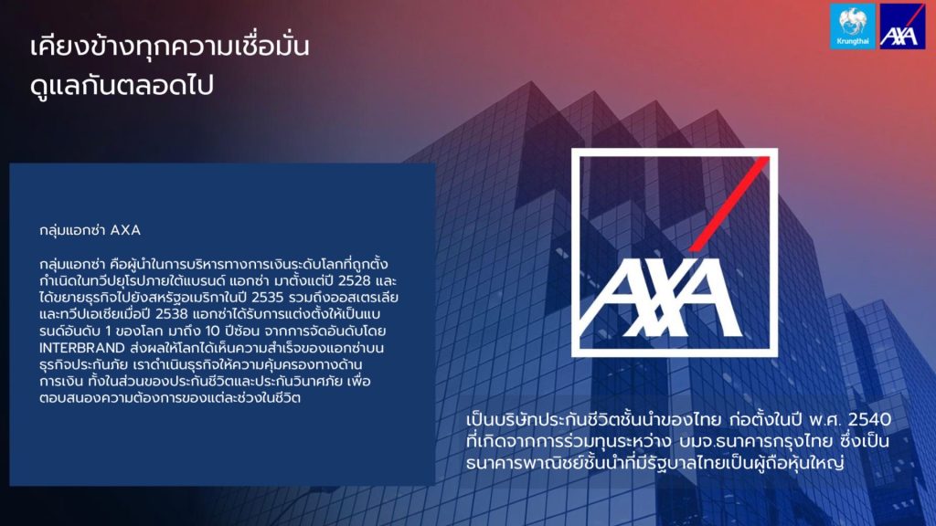 - เพราะจุดเด่นของแบนด์ แอกซ่า กับสถาบันการเงินกรุงไทย ที่กลุ่มราชกาลรัลเงินผ่านธนาคาร ทำให้มีความน่าเชื่อถือ